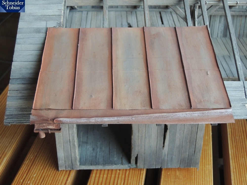 Die anderen Dächer erhalten normale Dachrinnen, so dass ich auch dafür entsprechende Teile anfertigte. Vorne werden Rinnen mit offenem Auslass verbaut.