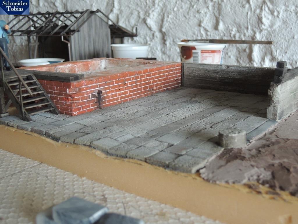 Da Gebäude und Landschaft in diesem Fall nicht richtig voneinander zu trennen sind, führe ich auch die Berichterstattung über den Landschaftsbau in diesem Thema fort.Es hat lange gedauert, bis ich die verschiedenen Fundamente und Bauteile an Ort un stelle hatte. Insbesondere die Betonsockel/Fässer für die Halle (vorne rechts) mussten in der Höhe ausgerichtet werden.