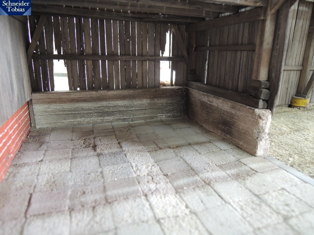 Eigentlich wollte ich mich im nächsten Schritt den Dachziegeln widmen. Das Ausrichten der Gebäude ist mir - weil es keine feste Bodenplatte gibt - allerdings nach mehreren Anläufen nicht zufriedenstellend gelungen. Deswegen habe ich mich entschieden, das Dach nach hinten zu schieben, bis die Gebäudeteile fest eingebaut werden können. Damit steht nun die Landschaftsgestaltung an.