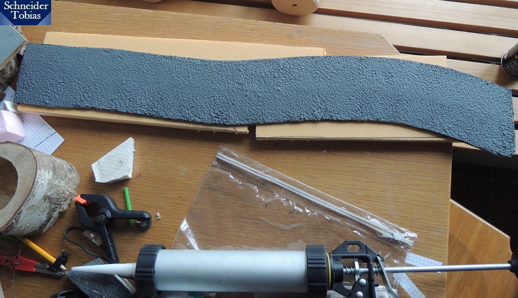Dann ging's an das Zurechtschnitzen des Styrodurs. Links verläuft eine Teerstraße, die über eine kleine Brücke führt - denn im hinteren Bereich möchte ich mich an einem Bachlauf versuchen.