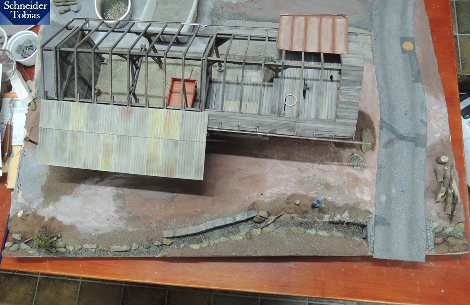 Die Straße ist dir mehr als gelungen, besonders gefallen mir da die beschädigten Stellen im Teer, das sieht sehr realistisch aus! Das letzte Bild sieht ein bisschen nach Baustelle aus wo ein Rohr repariert/ausgetauscht wird? Bin gespannt wo du das noch unterbringst, ich hab noch keine Stelle entdeckt