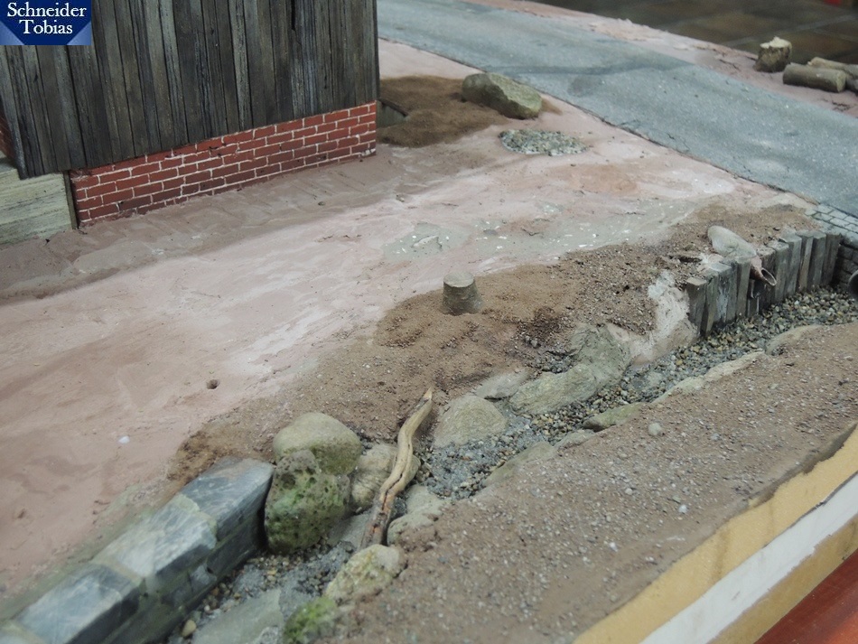 Bei meinen Vorbildfotos zeigte sich, dass das Bachbett am "Einlauf" etwas ins Rohr hineingeht. Ich denke, die Kiesel und der Schlamm werden über die Zeit ins Rohr gespült. Das habe ich versucht, auch im Modell nachzubilden.