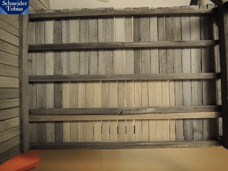 So sieht's von unten aus. Die neueren Bretter habe ich nur leicht gealtert - wie auch den neuen Balken