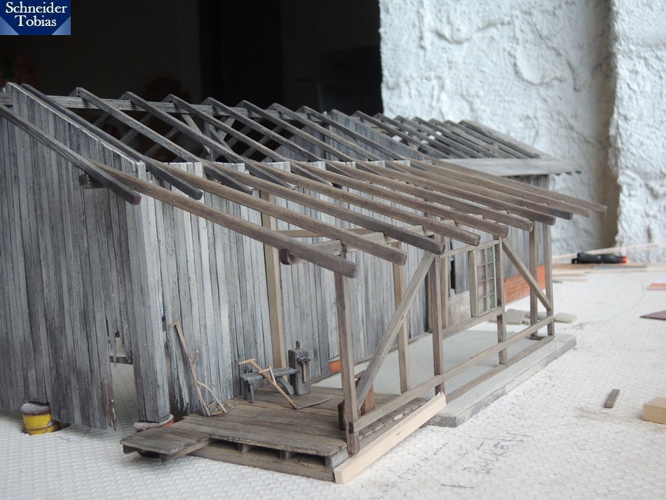 Die Bauteile bzw. Elemente sind bisher nur für eine Stellprobe aufgebaut worden - daher wirkt alles etwas schief. Der Holzverschlag ist wahrscheinlich der nächste Arbeitsschritt. Der Zusammenbau erfolgt erst, wenn das Hauptgebäude fest an Ort und Stelle steht.