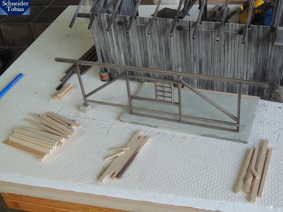 Die Bauteile bzw. Elemente sind bisher nur für eine Stellprobe aufgebaut worden - daher wirkt alles etwas schief. Der Holzverschlag ist wahrscheinlich der nächste Arbeitsschritt. Der Zusammenbau erfolgt erst, wenn das Hauptgebäude fest an Ort und Stelle steht.