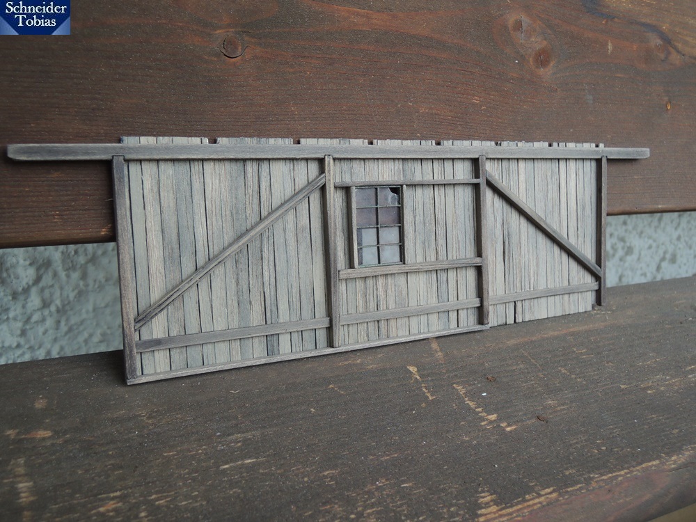 Dann habe ich die Leisten gealtert und zu einzelnen Elementen zusammengebaut. Hier kommt später z. B. das Garagentor rein...