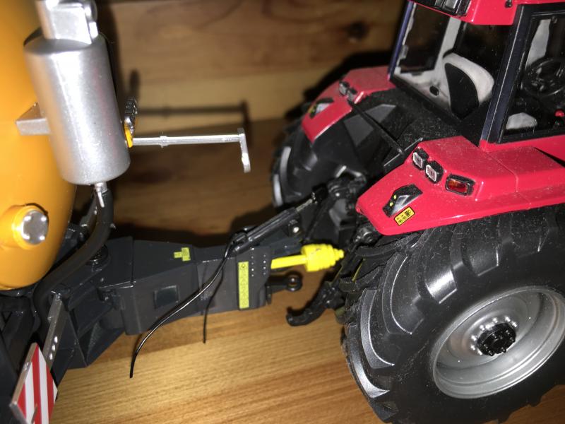 Ich hoffe nun, daß sich hier im Forum jemand damit auskennt und mir kurz beschreiben kann, wo die beiden Leitungen des Topzylinders üblicherweise angeschlossen werden. Am Schlepper, oder irgendwo am Fahrgestell des Hängers? Am Modell selbst erscheint mir die Länge der bereits am Zylinder angebrachten Leitungen zu kurz, insbesondere wenn man sie auch noch mit den weiteren Hydraulikleitungen durch die vorhandene Haltevorrichtung führen möchte. Aber vielleicht ist das ja nur bei meinem Exemplar so.