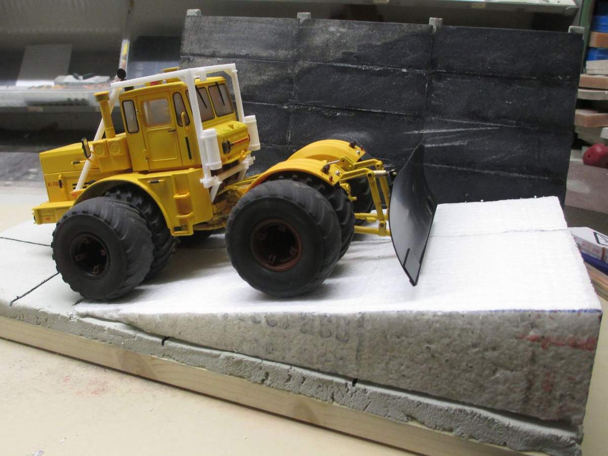 • So, ich hab die Oberfläche mal bearbeitet. Zum Kratzen habe ich mein Universalwerkzeug, ein Stukkateureisen genommen. Die Farbe habe ich bewusst mit fast trockenem Pinsel aufgetupft, damit sie nicht zu sehr in die Platten eindringt. Auf einem Originalbild habe ich gesehen, dass der Fugenmörtel die Farbe besser hält, das hat sogar im Modell funktioniert. Im Kunstlicht wirkt das auf den Fotos allerdings nicht so richtig.