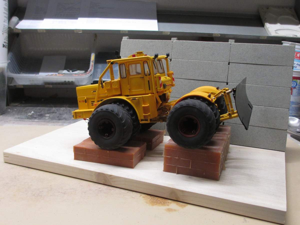 • Ich hab mir mal Gedanken gemacht, wie ich den zwillingsbereiften Kasi ausstelle. Einfach so auf den Tisch mag ich nicht so, schon weil am Modell durch das häufige Aus- und Einpacken schnell mal was kaputt geht. Es soll aber auch kein großes Dio werden, da ich auf absehbare Zeit noch den Ford Focus als Transportfahrzeug haben werde und auch auf den Ausstellungen der Platz meist begrenzt ist. Außerdem soll der Schlepper im Vordergrund stehen.