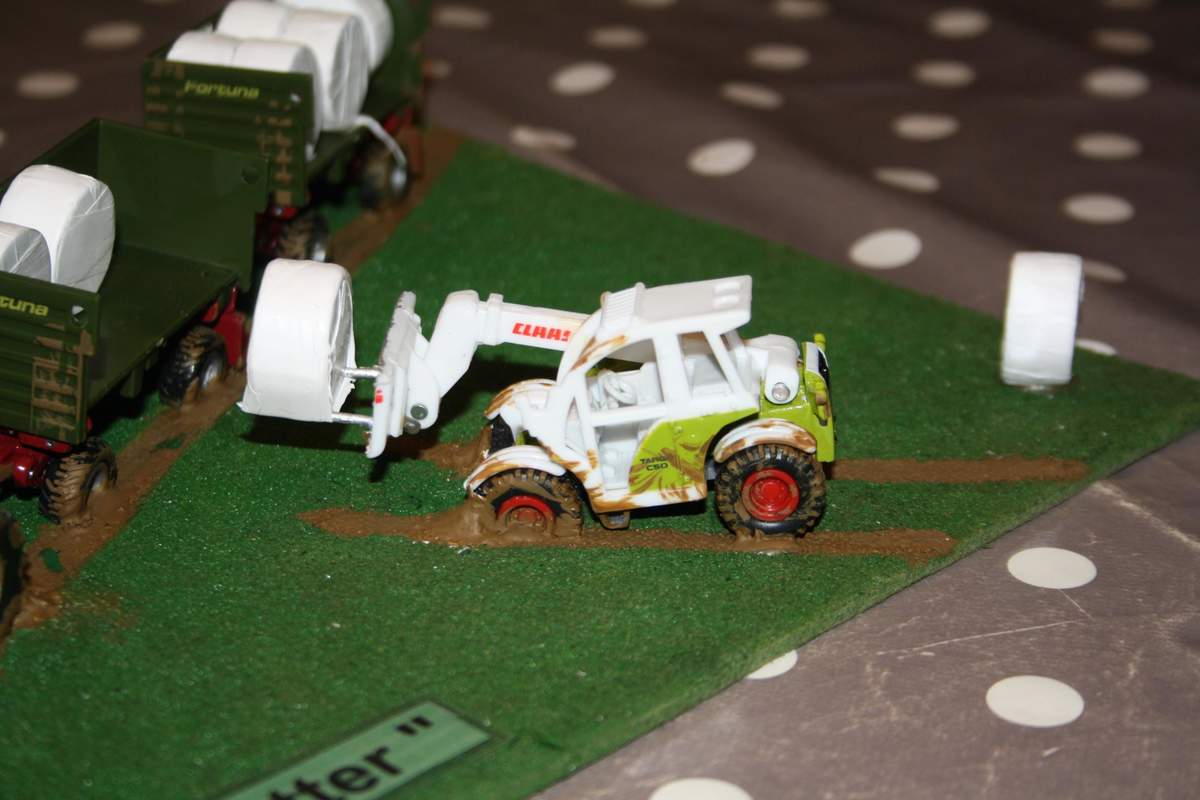 Ich habe den Boden einer Verlustkiste , dieser besteht aus Presspann , benommen und Grün angemalt. Die Siku Modelle sind ja keine hochwertigen Sammlerstücke aber ich finde für diesen Zweck völlig Ausreichend. Von den Rädern des JD und des ersten Anhängers habe ich einfach 1/4 abgeschnitten und diesen "Zug" auf dei Platte geklebt. Anschließend habe ich mit mattbrauner Farbe die Spuren auf den "Acker" gemalt. Deim Telelader bin ich genauso vorgegangen , hier habe ich allerdings aus der Schaufel eine Ballengabel gemacht .