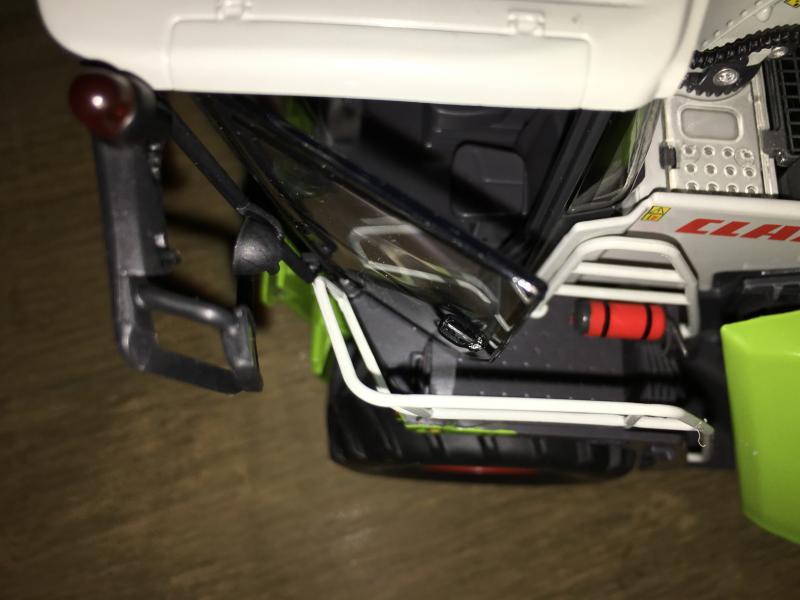 Zum Zeitpunkt der Verpackungserstellung beim Claas Jaguar war die Strebe am Geländer tatsächlich geplant. Dieses Detail war der Firma Claas und uns wichtig, aber sehr schwierig technisch umzusetzen. Bis zum letzten Termin haben wir versucht eine saubere Lösung des Problems zu finden, was uns aber leider nicht gelungen ist. Manchmal muss man bei Modellen im Maßstab 1:32 einfach Kompromisse eingehen. Eine Umsetzung der jetzt am Modell fehlenden Geländerstrebe hätte zu enormen Werkzeug- und auch zusätzlichen Fertigungskosten geführt, die für dieses Detail in keinem Verhältnis gestanden hätten. Nach Rücksprache mit der Firma Claas haben wir uns dann entschieden, das Modell wie jetzt ausgeliefert umzusetzen.
