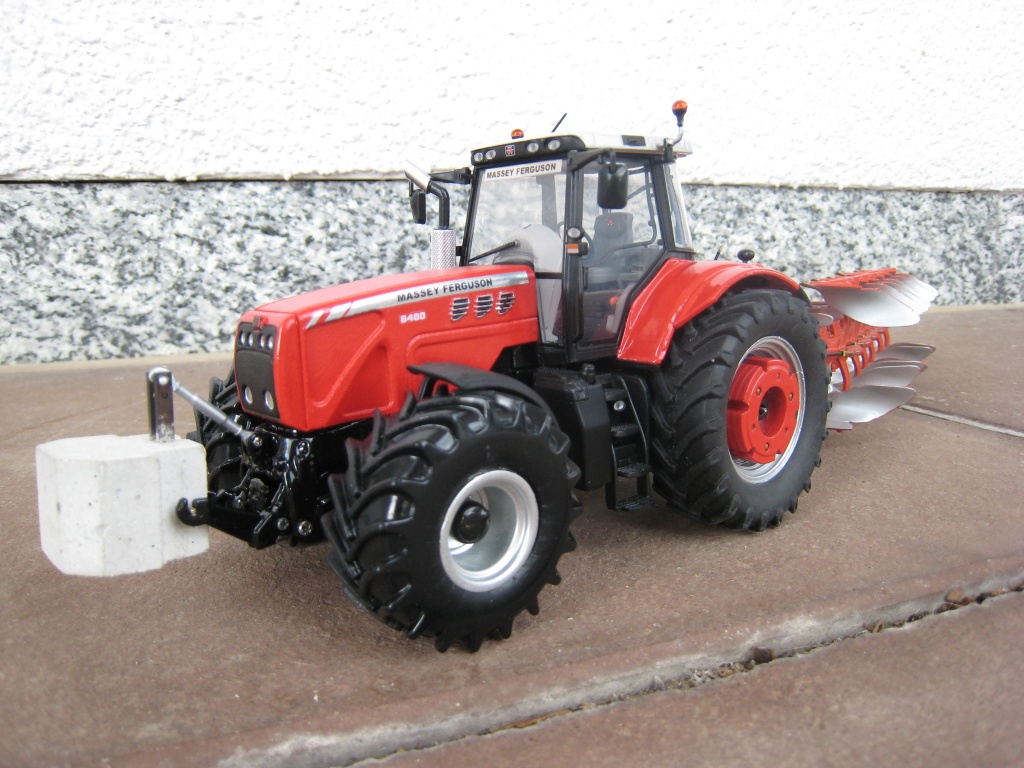 So jetzt zu einem weiterem Projekt. Dem Massey Ferguson 8480. Ein großer Dank geht hier erstmal an Michael! ( Mopar ). Von ihm habe ich den Abguss für die Haube. Er hat das Modell damals auf einem Britains MF 7480 aufgebaut. Dieser war mir aber vom Chassis und der Kabine nicht detailliert genung. Also habe ich einen UH MF 7499 als Basis genommen.....Das Chassis habe ich dann schwarz lackiert, die Haube war auch gleich lackiert......jetzt gab es nur ein Problem. Der MF 8480 hat hinten Kotflügel die einen Knick nach außen machen.......Diese hat der 7499 nicht....Also habe ich von einem UH Lambo die schwarzen Kotflügelverbreiterungen abgesägt und gefeilt, gefeilt, gefeilt und ja richtig nochmal gefeilt.....Dann lackiert. Bei der Bereifung habe ich micht bewusst für besonders dicke Puschen entschieden. Hinten sind Radgewichte vom Wiking Fendt 939 verbaut...normal sind die bei MF schwarz lackiert. Ich habe diese aber in rot gelassen. Ist mal was anderes und gefällt mir richtig gut. Außerdem habe ich auf AIE auch einen MF 8480 mit roten Radgewichten gesehen.