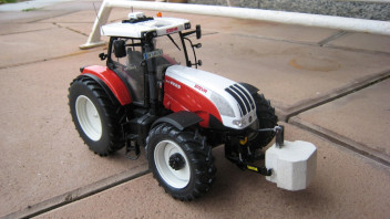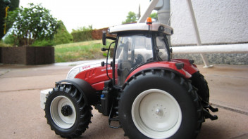 Was neues.....Habe mal wieder einen Steyr umgebaut. Einen Steyr CVT 6225 auf 2,25 Meter Spur. Als Grundlage habe ich von UH den Case Puma 230 genommen. Kabinendach und Motorhaube stammen vom Siku Steyr CVT 6240 Kommunal. Das Rot habe ich einheitlich lackiert. Die Reifen hinten stammen von der Wiking Lemken Vega. Vorne kommen die Reifen vom Schuco Claas Axos 330, die Felgen habe ich selber gebaut. Hier nun ein paar Bilder vom Modell: