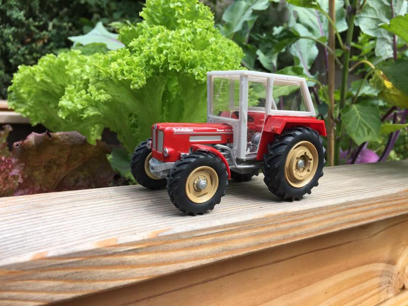 Ab 1970, mit erscheinen der eckigen Kotflügel, verbaute Schlüter serienmäßig Überrollbügel auf seine Schlepper, auf Wunsch gab es aber auch für die kleinen Typen eine Kabine, welche aufgrund des begrenzten Platzangebotes nicht die typischen Schiebe-, sondern Schwenktüren aufwies. Da ich noch eine Kabine von Siku übrig hatte wurde diese schnell etwas zurecht geschnitzt, allerdings gefällt mir das ganze noch nicht so wirklich, da sie natürlich ziemlich überproportioniert wirkt. Vielleicht setze ich mich da noch mal an einen Bügel mit Sonnendach oder gar mit Fritzmeierverdeck.