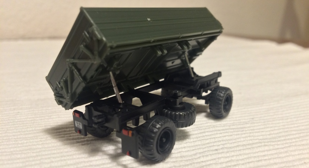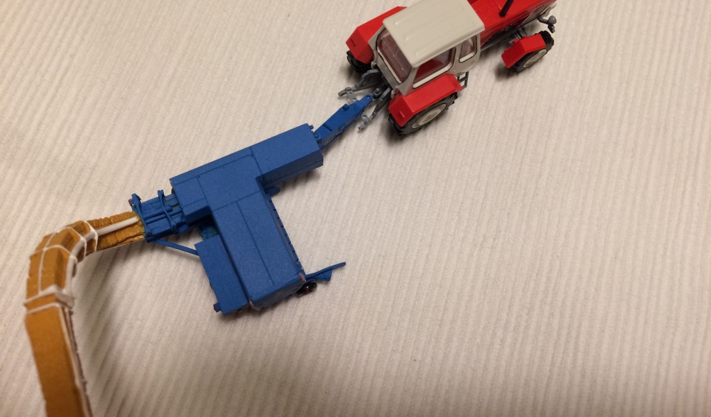 wiedermal sehr schön gearbeitet, lediglich eine Strebe vom hinteren Rahmen an den Überladearm fehlt. Gut, das sich nichts weiter bewegt muß ich nicht weiter ausführen. Im schönsten Fall, hätte man den Überladearm noch abknicken können für die Straßenfahrt. Apropos, die Zugdeichsel läßt sich für den Straßen- und Arbeitsbetrieb verstellen...
