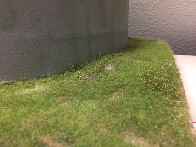 Auf der Platte ca. 70x70cm ist ein Güllebehälter mit einem Durchmesser von 50cm aufgebaut. Das Gelände habe ich nach hinten hin etwas angeschüttet um den Aushub der Bodenplatte zu entsorgen. Vorne führt ein Feldweg entlang. Der Schotter ist schon etwas "verschmutzt" weshalb er nicht durchgehend frisch aussieht. Die Begrünung soll etwas wild und ungepflegt aussehen, weshalb ich mit vielen Graßfasern unterschiedlichster Länge und Farben gearbeitet hab, eben alles was die Sammlung so hergegeben hat.