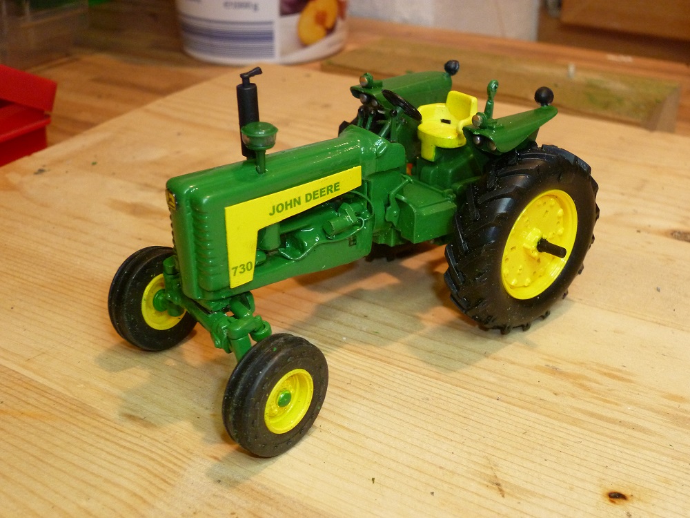 Hallo miteinander, heute möchte ich euch mal meinen letzten Umbauversuch vorstellen. Es soll ein John Deere 730 sein, ein USA Traktor nach 1950, der letzte Typ mit 2 !!! Zylindermotor. Ertl hatte diesen Typ in allen gängigen Maßstaben angeboten. Aber leider nicht in 1:32! Also hab ich mal ein Experiment versucht!