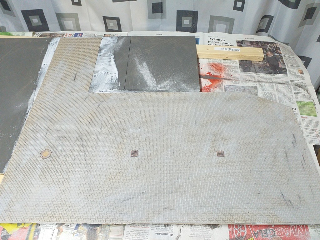 Die gesamte Dio-Grundfläche ist so groß wie eine Styrodur-Platte, also 125 x 60 cm. Die Hoffläche (vorerst nur dunkelgrau eingefärbt) selbst ist ca. 70 x 35 cm. Die möchte ich pflastern. Da weiß ich noch nicht so wirklich, wie ich's machen werde. Eine Idee versuche ich demnächst mal umzusetzen.
