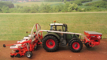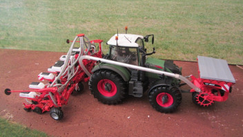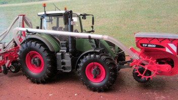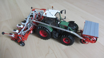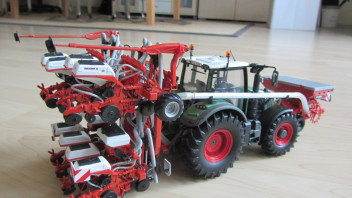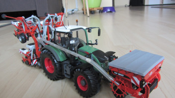 Dann war das Maxima-Gespann dran. Dort habe ich die feste Leitung inkl. Halterungen an den Fendt 724 angebracht. Weiterhin hat der Fronttank noch das seitliche Saatgut-Dosierrad bekommen: