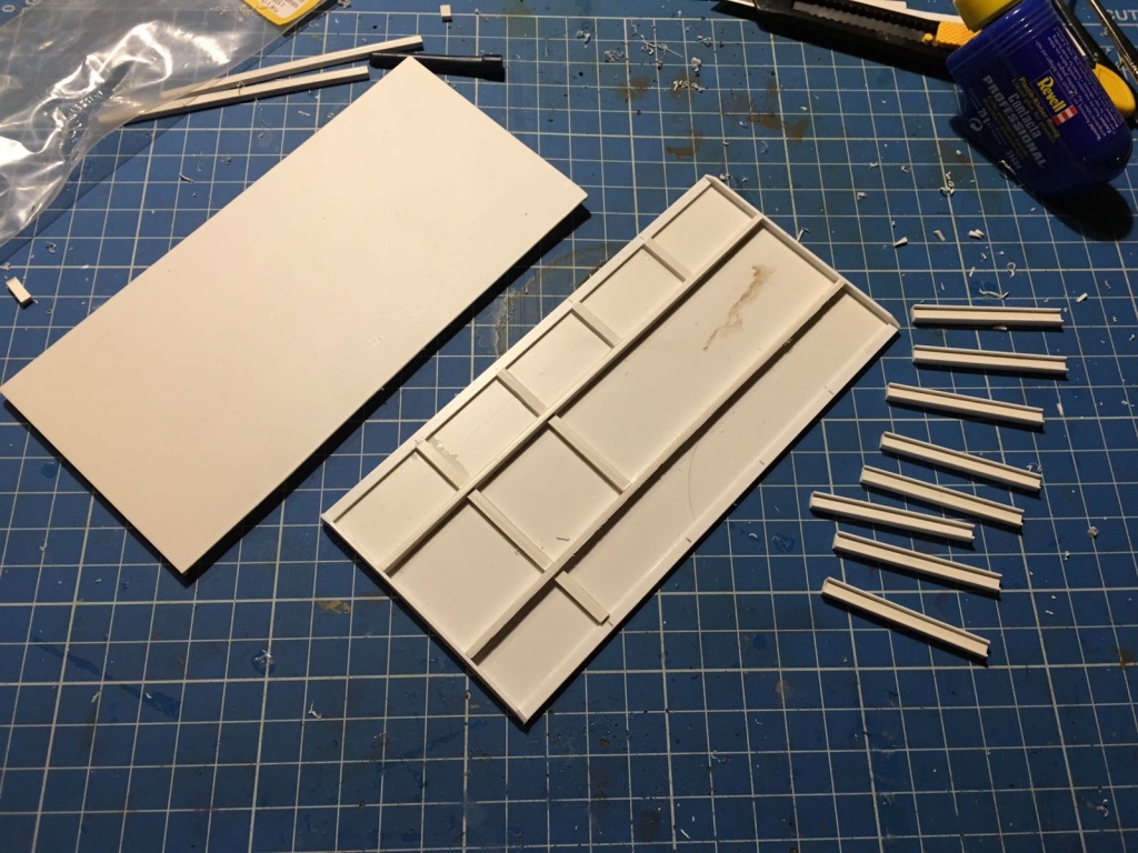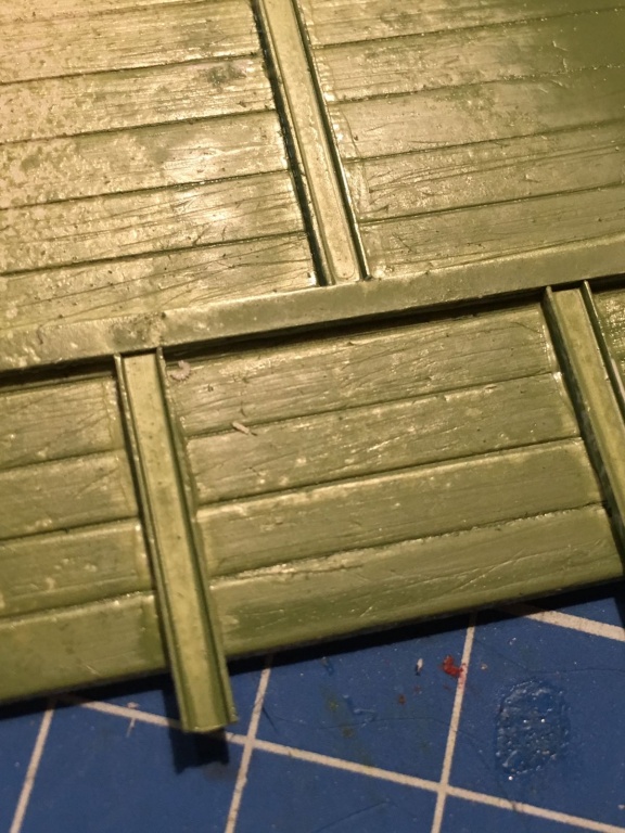 Die Bordwände sollten ursprünglich wirklich aus Holz werden, da ich aber nur 4mm Sperrholzplatten hier hatte und das einfach viel zu dick war, habe ich mich entschieden die einzelnen Bretter in eine Polyplatte einzuritzen und etwas mit der Struktur zu spielen. Schnell noch nen Spritzer Lack drüber um zu sehen ob die Struktur erhalten bleibt - Passt!
