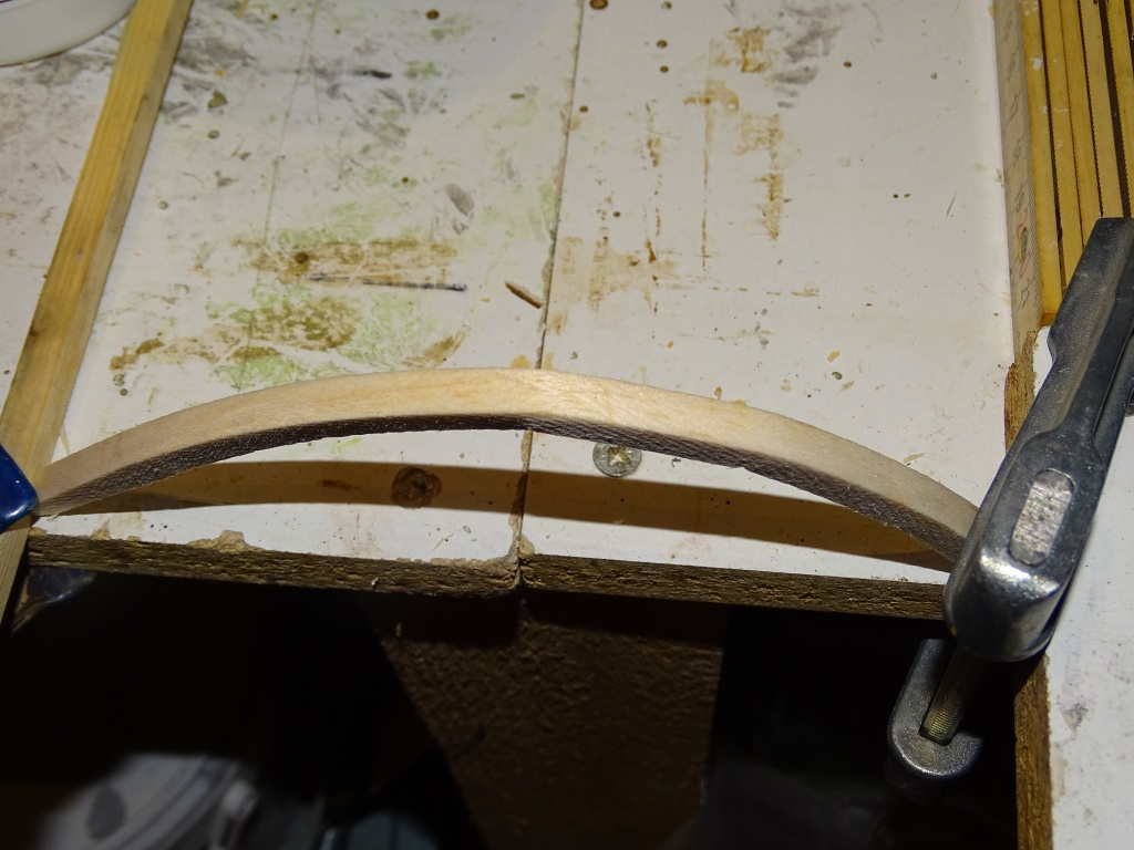 Ich biege grad das Holz für die Ochsenaugen der Scheune. Hab eine Seite etwas aufgeraut ,das ganze gut in