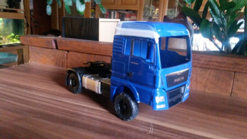 Er entstand aus einem nagelneuen TGX von welly. Zersägt und neu Modeliert entstand ein Tgx mit xl Fahrerhaus und Allradfahrgestell.Dach abgesägt und Stoßstange geändert.
