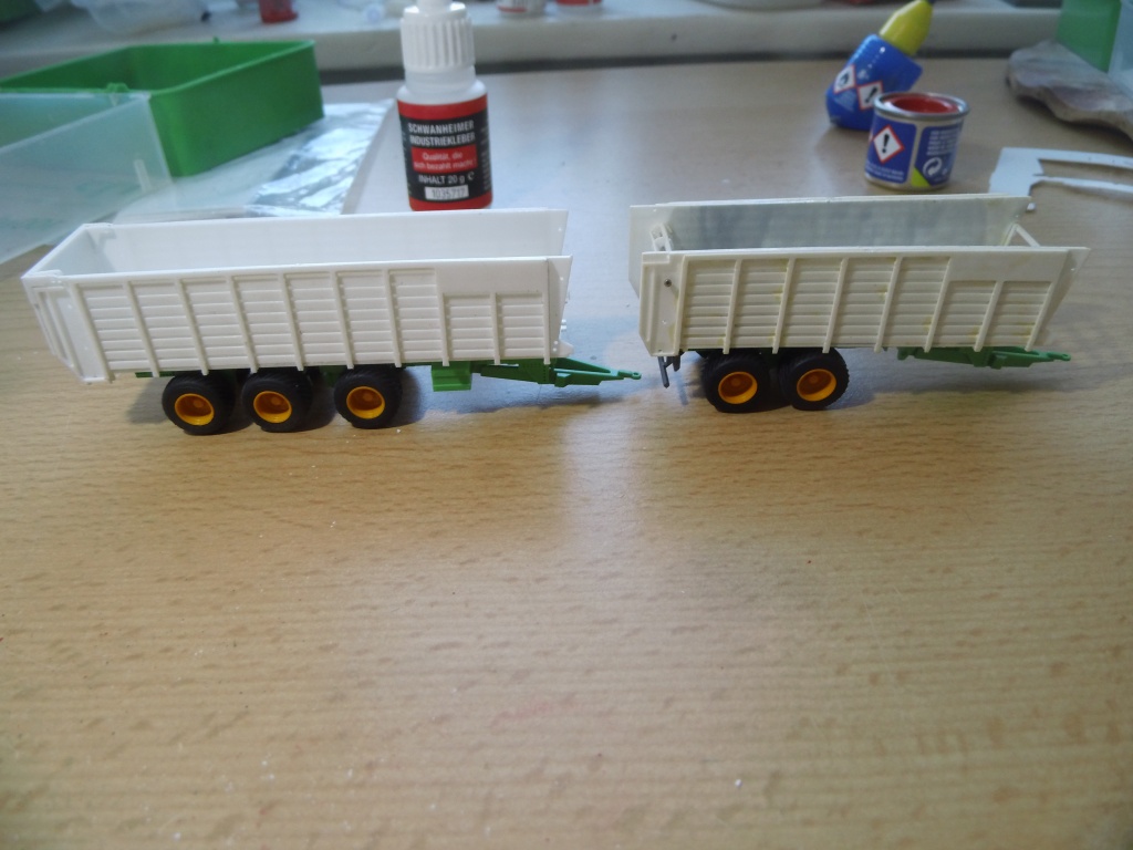 Grippebedingt mit ein paar Tagen Verspätung. Habe am 26-50 etwas weiter gemacht. Fahrgestell vom Joskin Tandem verklebt. 3te Achse angebaut und sah scheiße aus. Achsabstände zu gering. Also alles wieder runter. Achsabstände auf 20 mm vergrößert ( ja, habe ich woanders geklaut ), und jetzt sieht es stimmig aus.