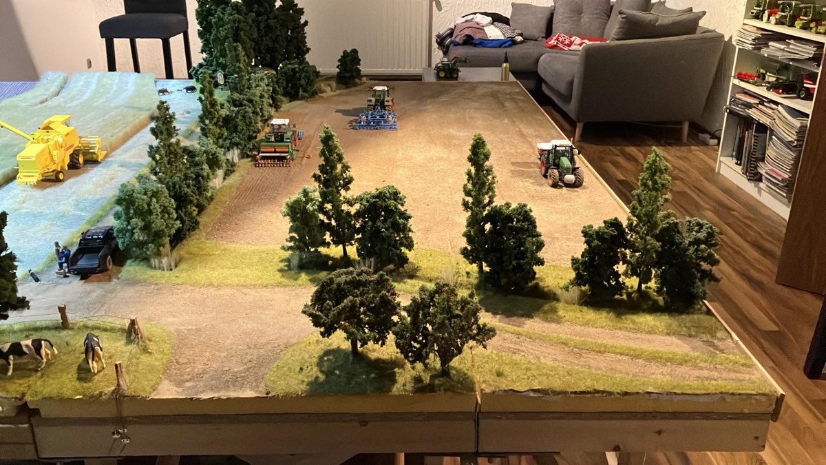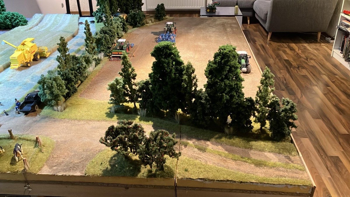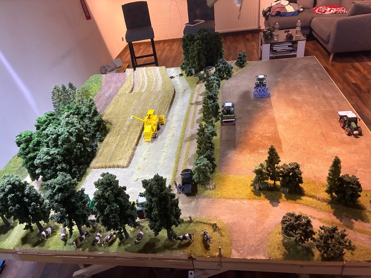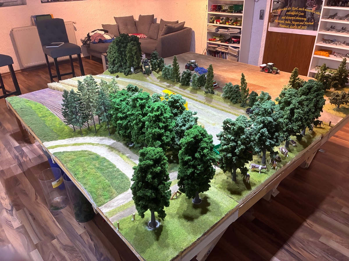 Die beiden Bäume auf der Weide bekommen noch ihren Fuß, der Zaun wird gezogen und dann die Details.