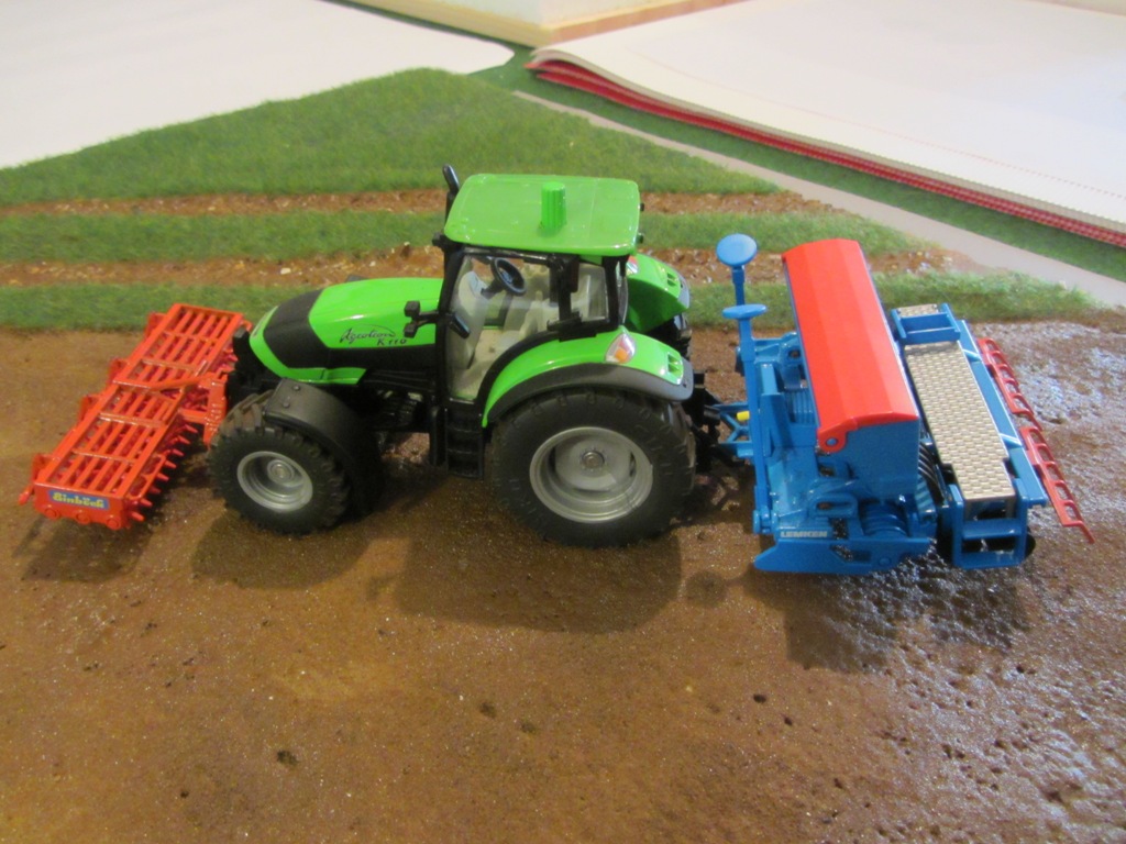Für etwas größere Gelegenheiten ist ein anderes Gespann am Werk: ein Deutz-Fahr Agroton K110 (Siku) mit der Lemken Saat-Drill-Kombi hinten (Siku) und der Einböck Frontsternwalze (Siku):