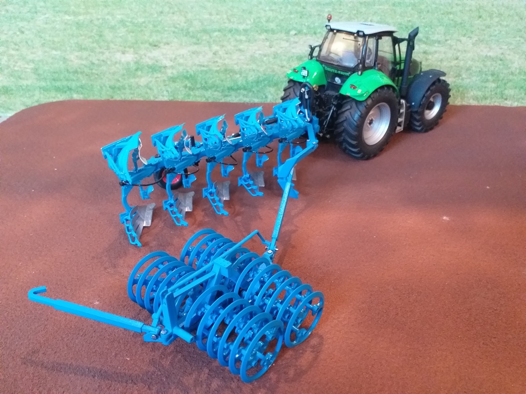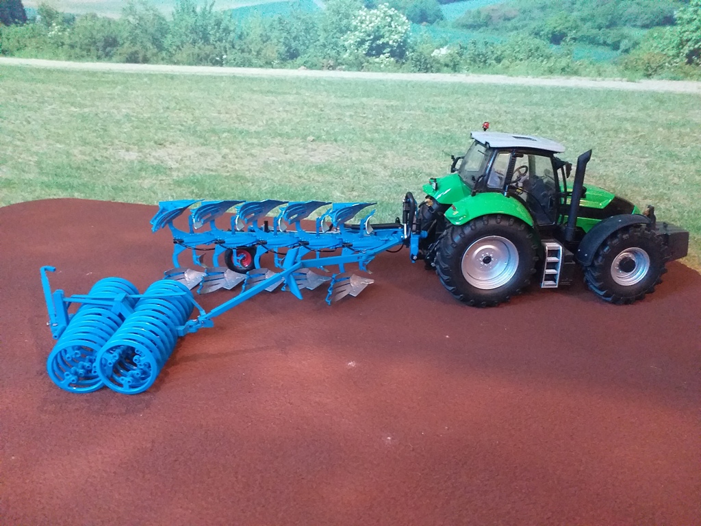 Aus Trecker Tim’s Bausatz wurde mit etwas Farbe, Verbindungsstiften und Ringen des Lemken Frontpackers ein Nachlaufpacker für den Lemken-Pflug. Im Original wäre das dann ein Lemken Vario Pack 110 FEP 250-90, passend zu den 2,50 m Arbeitsbreite des Juwel 8.