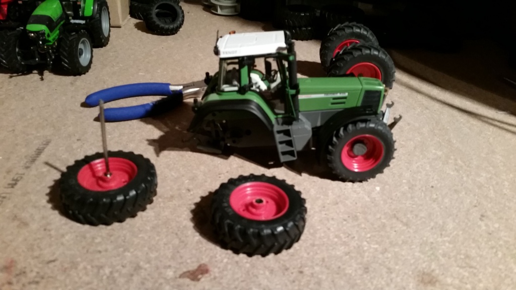 Guten morgen an alle ! Ich habe mir mal den fendt 926 1. gen vorgenommen und ihn mir mal etwas umgebaut ! Er gefiel mir mit diesen enormen radgewichten hinten in den Felgen absolute nicht ich finde das passt gar nicht zu dem modell !! Also wie gesagt modell geschnappt und umgebaut !! Wenn euch der kleine umbau gefällt würde ich mich über Nette Kommentare sehr freuen ! Anbei die Bilder ! Erstmal die vorder reifen abgebaut und durch siku valtra reifen ersetzt ! dann habe ich einen siku fendt 718 geschlachtet und die komplette Hinterachse ausgebaut und wollte schauen ob sie rein geht in das Modell und von der Höhe passt ! Passt alles sehr gut das einzigste Manko mann muss das Modell ausbohren also einmal durchs modell durch das die siku achse durch passt ! Gesagt getan erstmal achse raus alte durchbohren achse einsetzt und probiert ! Und hier das Endergebnis mein 926 hat endzwischen auch vorne siku 718 bekommen da ich zuerst nur siku valtra für vorn und siku 718 für hinten hatte aber dank einem Kollegen jetzt beides hab . Ich hoffe er gefällt euch so ! Freu mich über jede Kritik! Euch einen schönen Tag !