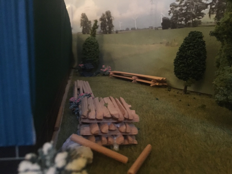 Blick hinter den Schuppen, wo die Doppellatten lagern
