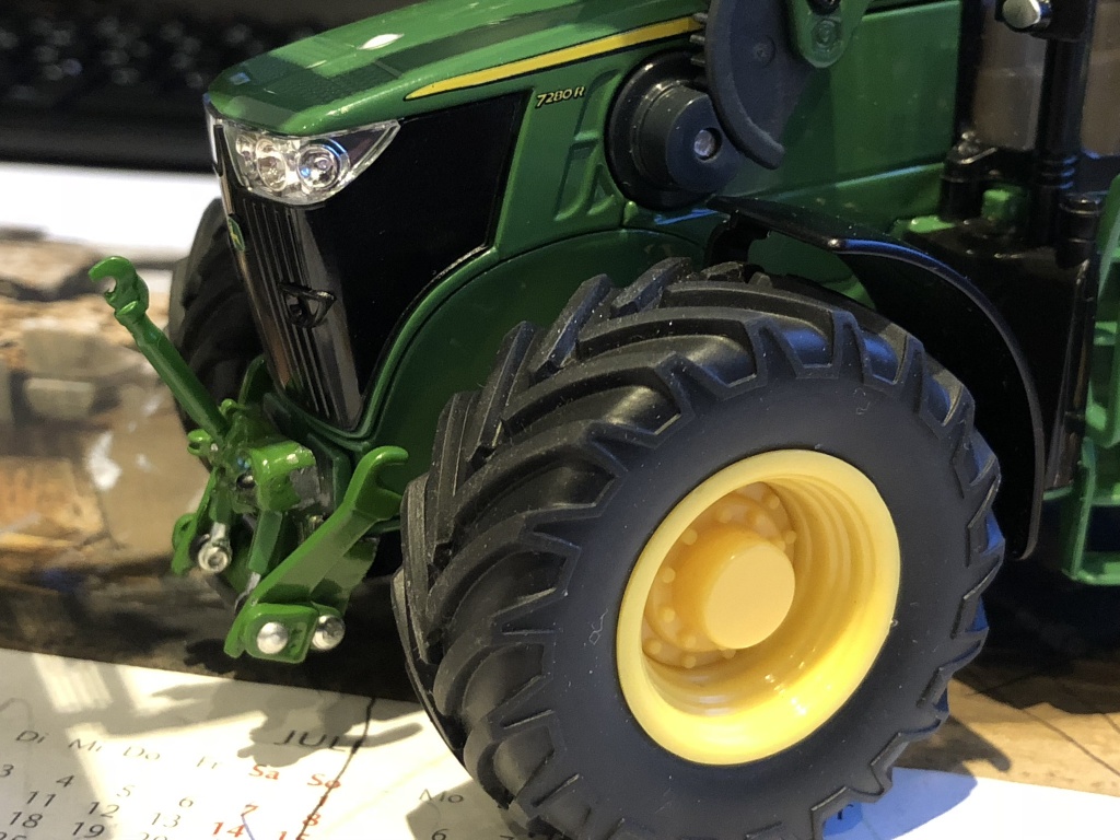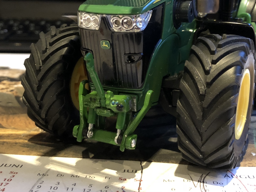 Da die original siku FH nur stört und man schon bei kleinsten Materialien hängen bleibt hab ich meinen mit einer 3 Punkt FH klappbar vom Wiking JD mit FL ausgestattet.