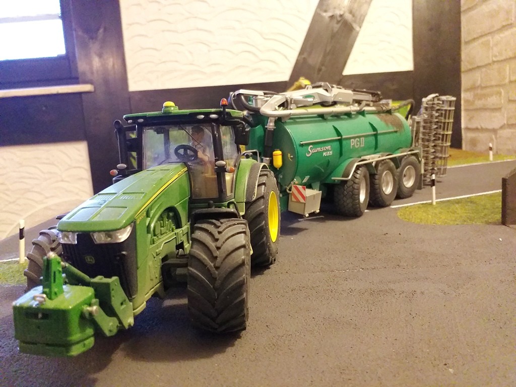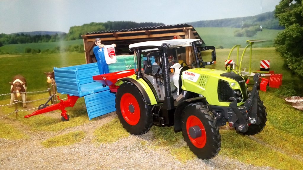 Heute früh hat er schnell noch die Pflegereifen auf den neuen Claas Arion montiert, der erst wenige Betriebsstunden gelaufen ist. Dann noch schnell den Kuhn Streuer aus der Scheune angekuppelt und los ging’s zum Unterstand. Das Füllen des Streuers macht Jupp noch in Handarbeit. So viel Dünger ist’s ja schließlich nicht, dass sich ein größerer Aufwand lohnen würde.