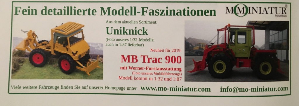 von MO-Miniatur gibt es einen neuen Newsletter mit Bildern des 900er MB-Tracs mit Forstausrüstung