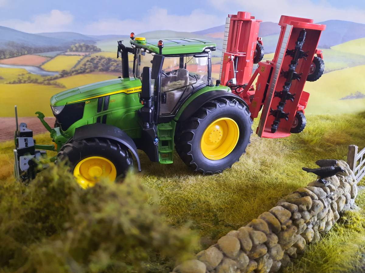 Damit er etwas zu tun hat, habe ich ihm den KUHN-Mulcher von REPLICAGRI angehängt. Da dieser Mulcher bekanntlich ein ordentliches Gewicht hat und der JOHN DEERE mit dem mitgelieferten Frontgewicht an der Vorderachse ein bisschen leicht wurde, habe ich ihm einen AGRI-Bumper verpasst. So passt es. Ansonsten muss ich WIKING wirklich loben: die Heckhydraulik hält den Mulcher wacker oben und dies ohne irgendwelche Sperrvorrichtungen wie sie zum Teil bei anderen Herstellen zum Einsatz kommen.Gruss Polä
