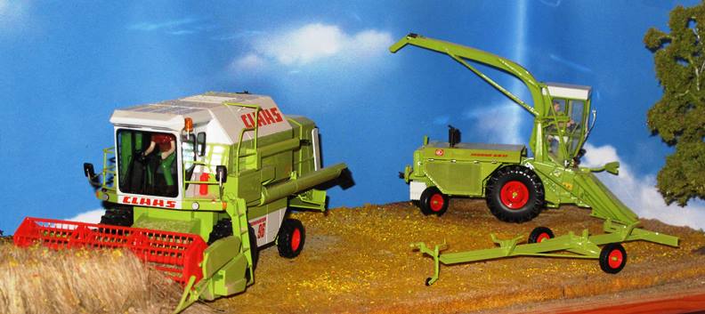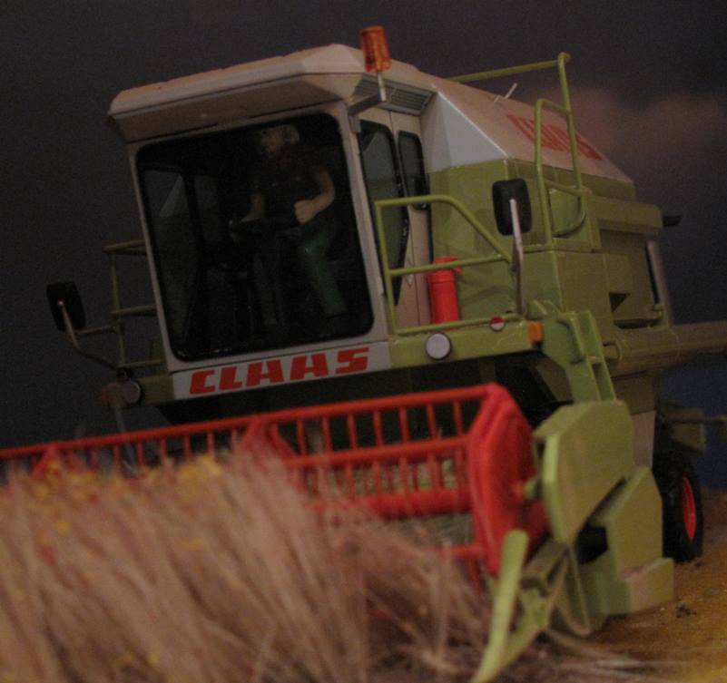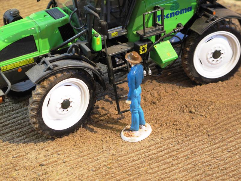 Im Grunde ist es sog. "Beflockung" aus dem Modellbauladen Kramm in Hilden. Ich habe eine Platte harter Pappe in Reihen zu je 50 cm geteilt durch Maßstab 32 unterteilt, mit braunem Modellbauleim eingepinselt und die Flocken in Reihe einzeln mit den Fingern gezupft und auf den Leim gedrückt, dann habe ich im Laufe mehrerer Tage (zwischendurch immer wieder trocknen lassen) transparenten Leim dick über die Flocken fließen lassen, so dick, dass der Leim die viel zu dünne Struktur der Flocken miteinander verklebt und "Blattflächen" entstehen. Dann insgesamt für dieses kleine Diorama insgesamt 3 x 30 ml Revell matt/seidenmatt Lack in drei verschiedenen Gründtönen mit dickem Pinsel richtig fett auf die Struktur tropfen lassen, so dass weitere "Blätter" durch Verklebung entstehen und die vorhandenen, ausgtrockneten "Leimblätter" grün werden. Wenn alles ganz sicher durchgetrocknet ist, zwischen die Reihen ganz fein gemahlene (zuvor getrocknete und im Ofen kurz auf über 100 Grad erhitze Lösserde) vorsichtig zwische die Reihen gestreut. Dunkleres Kaffepulver in den Bahnen, die der Rode scheinbar gerade geerntet und mit per Siebstern ausgesiebter Erde bestreut hat. Grünes feines Beflockungsmaterial dort streuen, wo der Rode scheinbar das gehäckselte Rübenblatt hingeschleudert hat. Einige kleine weiße Stücke FIMO winzig klein zerreißen und als Absplitterungen von Rübenstücken und Rübenköpfen leicht verteilen. Mit dem beteiligten Rode exakt die Bahnen fahren, die er in echt gefahren wäre und Spuren erzeugen, ebensp mit eventuellen weiteren Fahrzeugen Spuren erzeugen.Hellere Erde dort, wo die Erde schon abgetrocknet sein soll. Eventuell mit weichem großen Borstenpinsel nachkorrigieren. Beim Streuen von Erde und Kaffepulver die Rüben"pflanzen" möglichst mit einem zurecht geschnittenen Stück Papier abdecken, da die Pflanzen gerne Staub schlucken, der sich schwer wieder entfernen lässt. Einige aus FIMO selbst gebastelte Rüben mit Cuttermesser halbieren und köpfen und zwischen Köpfer und Rodescharen entsprechend Reihenzahl platzieren. Einige Rüben in den Siebstern und einige mehr in den Bunker geben. Schon fertig;-)