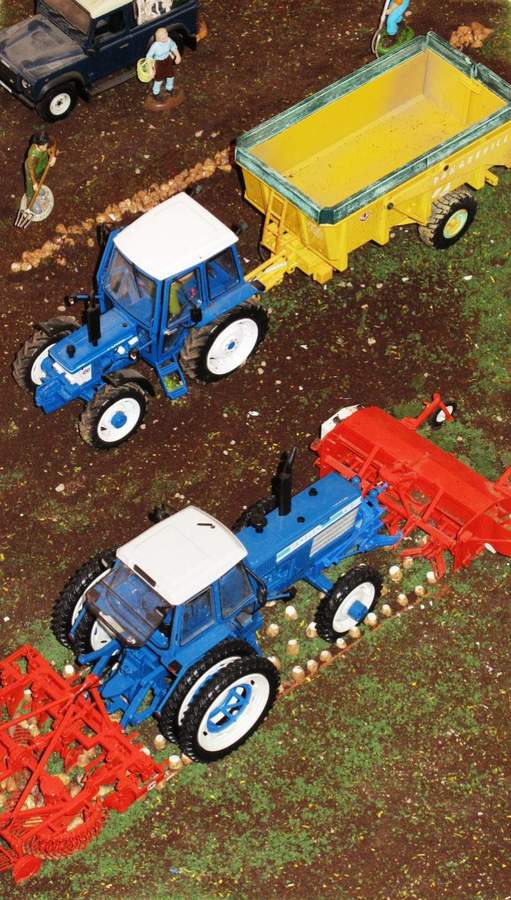 Von der Rübensaat zur Rübenernte: Hier ein recht schnell und noch nicht ganz vollständig umgebautetes Rübenernte-Diorama mit Ford-Traktoren. Ich hoffe, dass irgendwann noch ein passender Rüben-Überlader oder Rüben-Sammelbunker herauskommt. Bis dahin muss man sich die mechanisierte Rübenverladung auf den gezeigten Kipper an anderer Stelle vorstellen. Die beiden "Knechte" helfen nur dabei, einige verloren Zuckerrüben sauber auf das Schwad zu legen ...