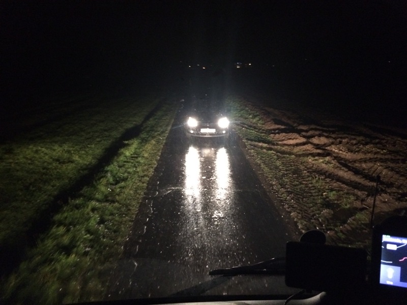 Ein guter Kilometer rückwärts im dunkeln bei regen auf einer kurvigen engen Straße ohne Wendemöglichkeit.