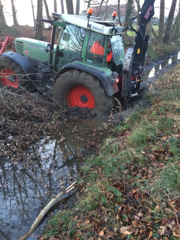 Sein Plan war rückwärts an den Bach heran zu fahren um Stämme auf der anderen Seite greifen zu können.