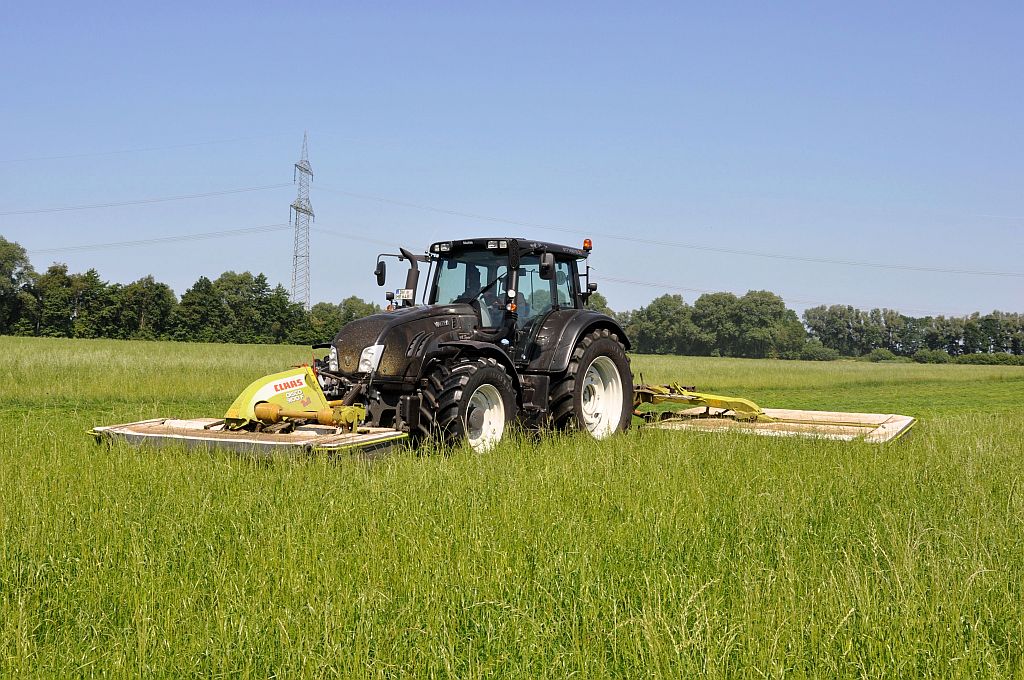 Das mähen wurde eh mit 2 Schleppern gemacht, wobei die Fahrer wg. unserer Verspätung extra eine kurze Pause einlegten, damit die Fläche nicht schon vorher gemäht war! Das geht bei 2 Gespannen nämlich recht fix. Danach hat uns der Boss persönlich zu den nächsten Einsatzstellen (zetten und schwaden) als Vorausfahrender geleitet und organisiert, dass der Aushilfsfendt nach getaner Arbeit auf einer anderen Fläche noch zum größeren Schlag kam, wo der Valtra mit dem 4-Kreisel Schwader zugange war. Zwischenzeitlich hat er noch für uns einen Termin zum Heu pressen organisiert und als wir bei der Hallenbesichtigung so aus jux gesagt haben, das er doch bestimmt mit 2 Pressen los fährt, hat er auch dieses möglich gemacht und einen Fahrer für das 2te Gespann organisiert!