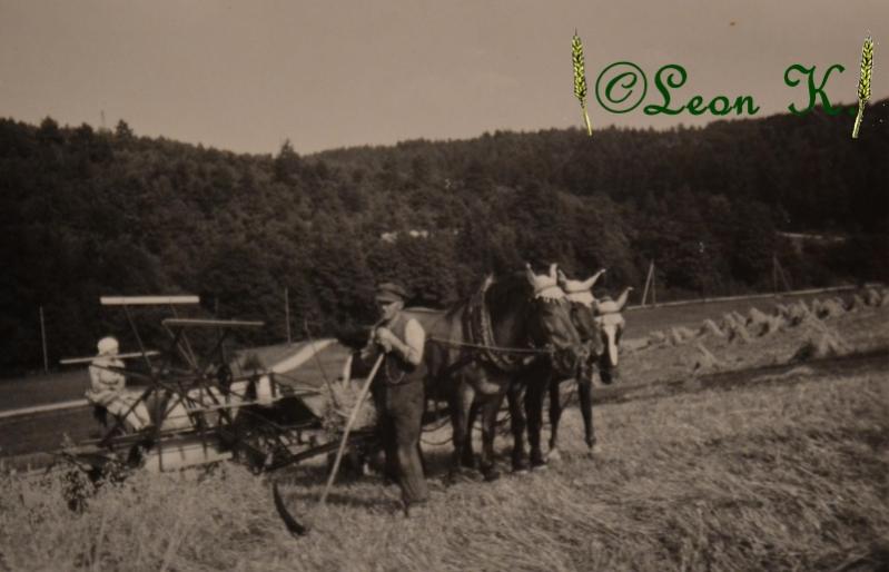 Die erste Erntemaschine auf dem Hof, ein Mähbinder, gezogen von 3 Pferden
