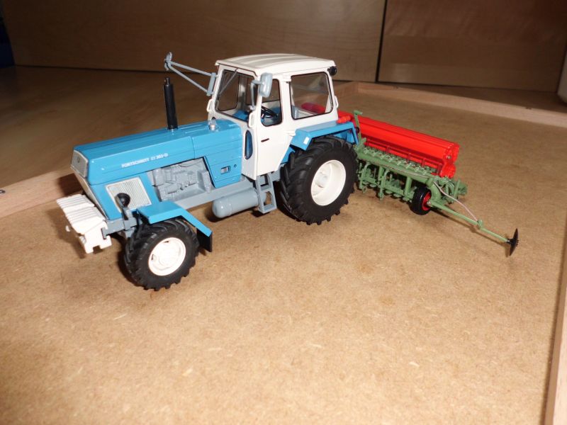 So, dann will ich auch mal wieder. In der letzten Woche gab es den DX, den Huard Pflug und die Nodet Drille samt Kuhn Kreiselegge. Der Deutz ist bislang mein qualitativ bestes Weise Modell. Kein Lackfehler, es wackelt nichts, alles passt, und nicht ein Fett- oder Fingerabdruck. Der ist perfekt. Wäre super wenn das bei Weise so bleibt. Am ZT habe ich mir bei der Gelegenheit mal die vorderen Kotflügel vorgenommen. Der Abstand zum Rad hat mich schon lange gestört. Eigentlich müssten auch die Lampenträger noch weiter nach vorn. Aber als ich einen ab hatte konnte ich sehen, dass die in einem Loch im Rahmen verklebt sind. Das hätte ich dann zuspachteln. schleifen und lackieren müssen. Dazu fehlt mir momentan die Zeit. Und natürlich auch ein Pflichtkauf, der 323 in 1:87 von Busch :p.