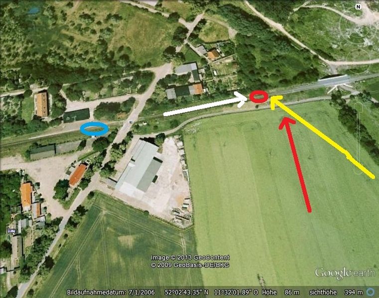 Kurioserweise geschah der Vorfall nur ca. 100 Meter entfernt von der Stelle (blauer Kreis), die meinen Heimatort 1967 durch das schwerste Zugunglück der DDR weltbekannt machte.