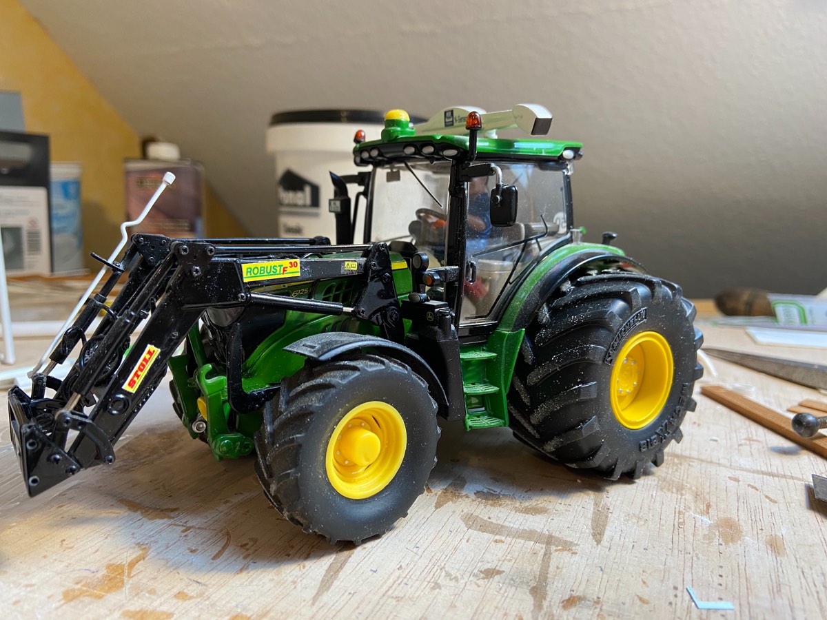 Einmal der John Deere 6125R. Da habe ich die Felgeneinsätze hinten noch lackiert und den Yara Sensor lackiert, sowie beklebt.