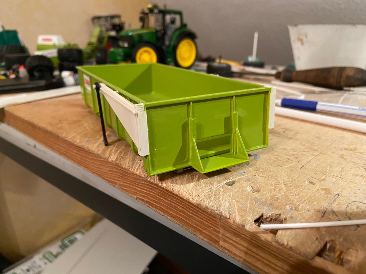 Für die Claas Mulde habe ich mir jetzt andere Reifen besorgt, die passen besser zu 1:1 Vorbild. außerdem habe ich der Klappe einen funktionierenden Kornschieber verpasst und den Häckselaufbau fast fertig gestellt. Also ich dachte er wäre fast fertig. Leider ist mir dabei ein kleines Malheur unterlaufen, sodass ich da nochmal ranmuss, damit die Klappe auch weiter aufgeht.