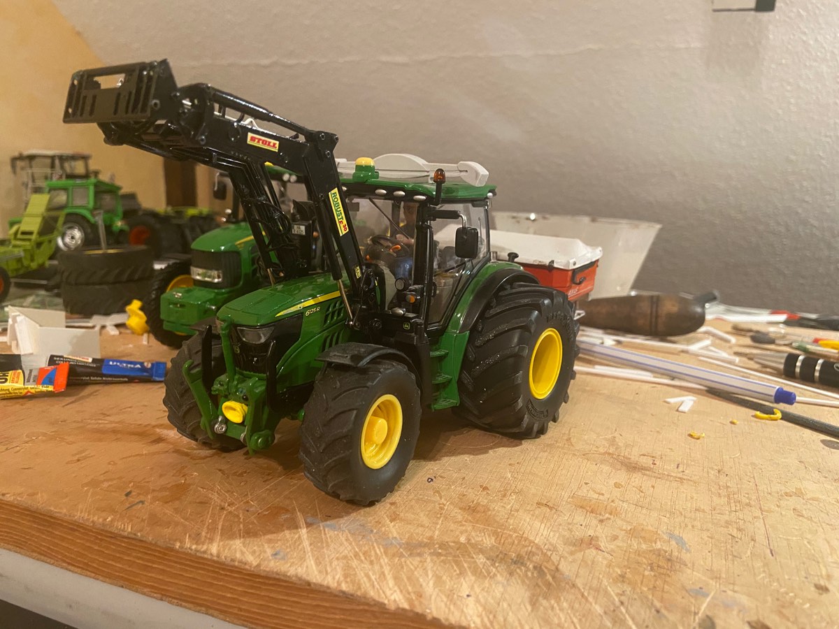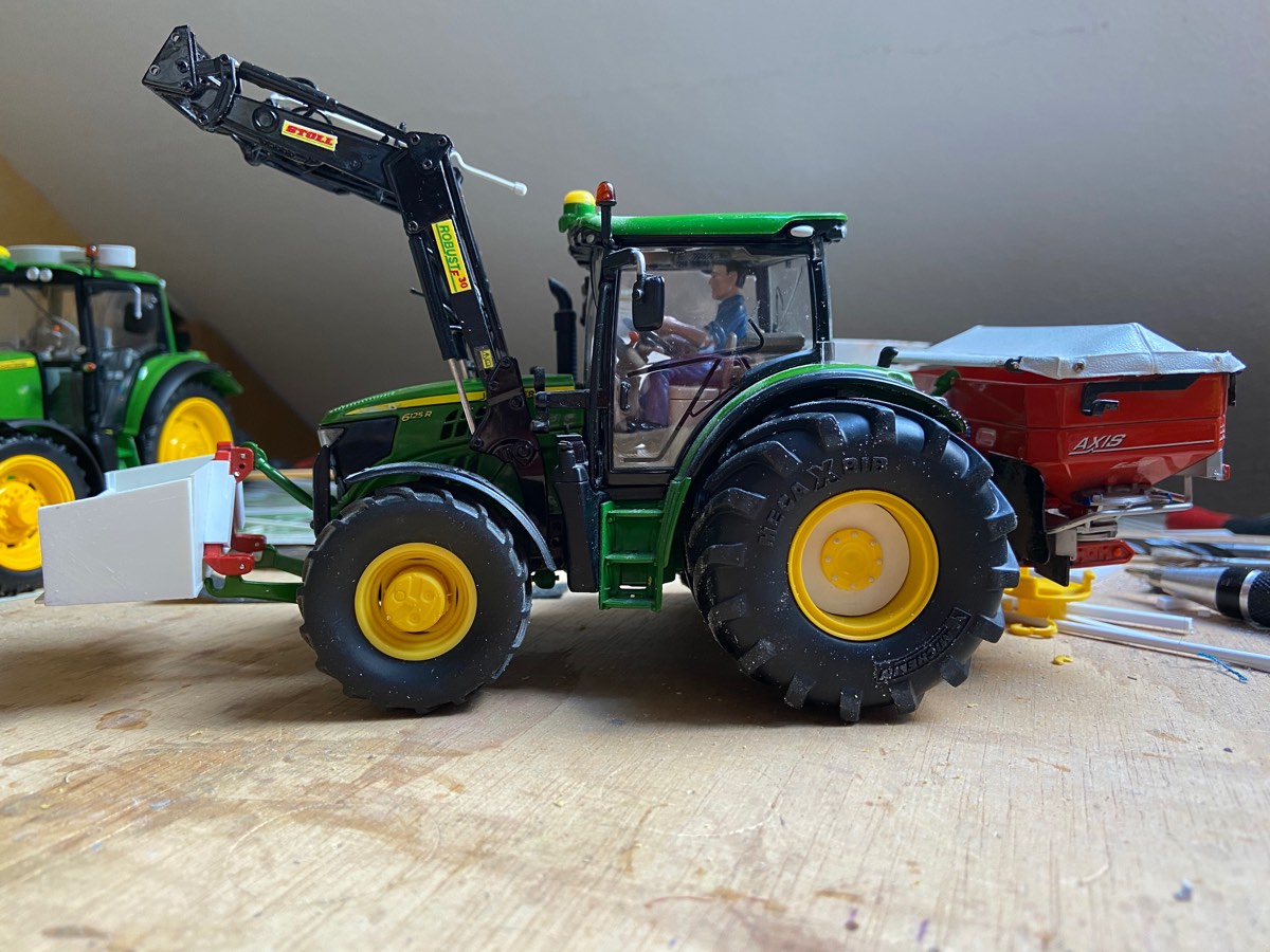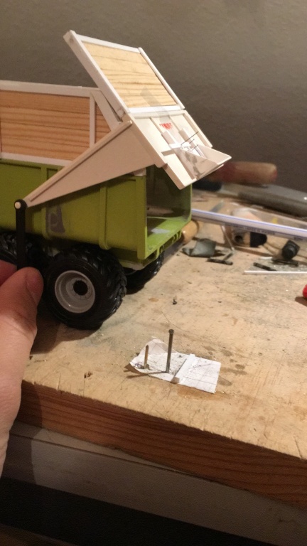 Für die Claas Mulde habe ich mir jetzt andere Reifen besorgt, die passen besser zu 1:1 Vorbild. außerdem habe ich der Klappe einen funktionierenden Kornschieber verpasst und den Häckselaufbau fast fertig gestellt. Also ich dachte er wäre fast fertig. Leider ist mir dabei ein kleines Malheur unterlaufen, sodass ich da nochmal ranmuss, damit die Klappe auch weiter aufgeht.