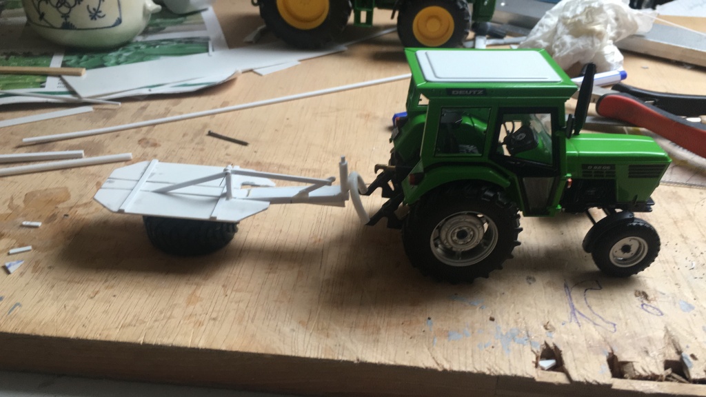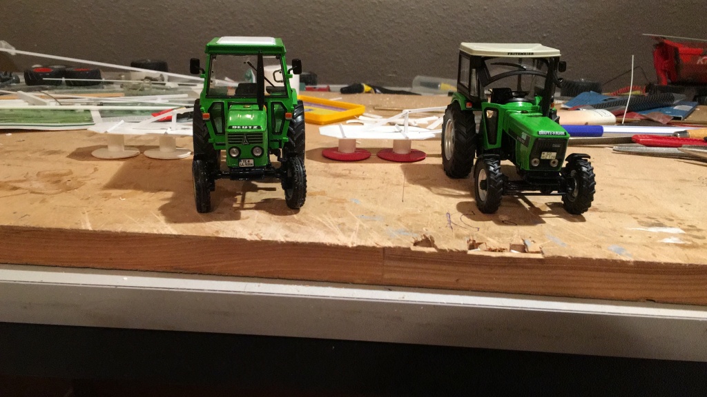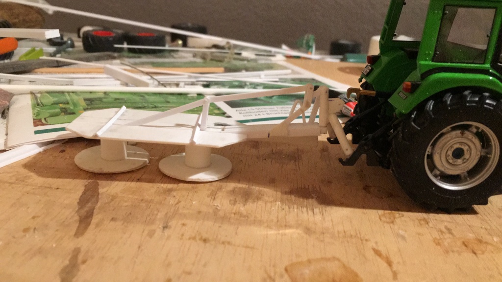 Dann habe ich noch angefangen ein kleines Mähwerk zu bauen, da ist noch einiges zu tun. Die Gleitteller müssen auf jeden Fall auch noch geschliffen werden, da war aber zum Zeitpunkt des Fotos der Kleber noch nicht trocken.