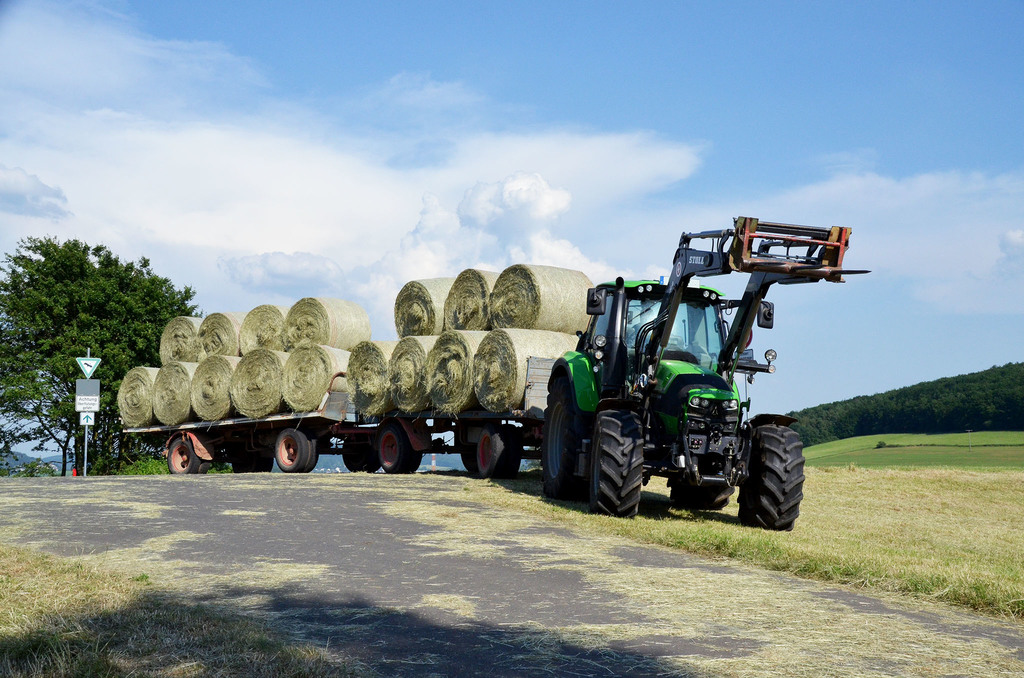 Der Deutz gehört zum selben Betrieb wie der 620 TTV vom Anfang. Hier werden gerade die Ballen vom Staudamm eines Rückhaltebeckens geholt - keine einfache Sache