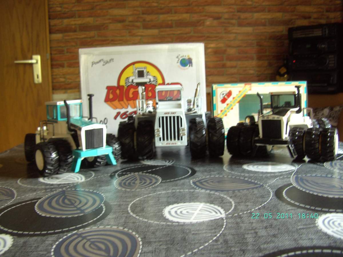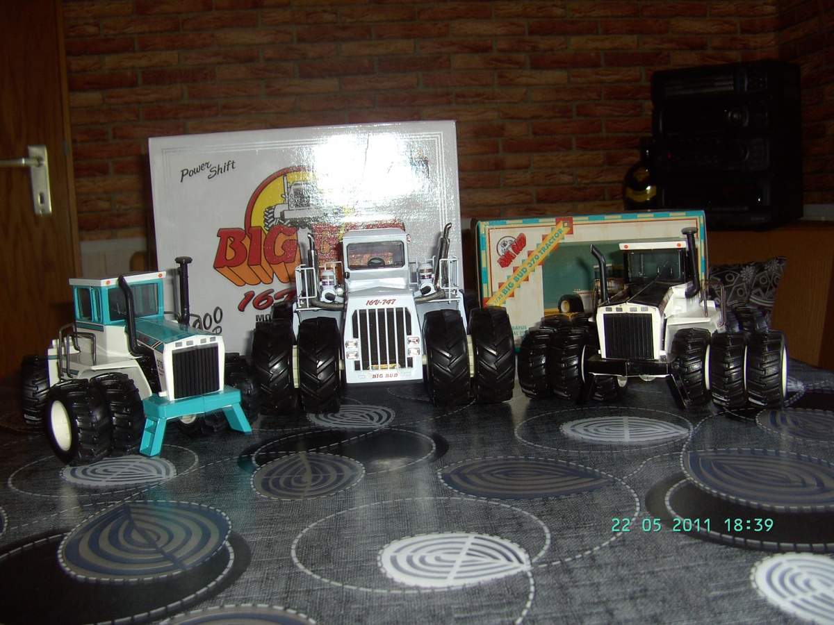B: Die einzigen wahren Schlepper: Big Bud (Big is bautiful). Links Big Bud 360/30 Serie 4 Bafus Blue (Robert Bafus kaufte fünf Big Buds in seiner Hausfarbe Aqua Blue) Mitte Big Bud 16V-747 der Schlepper. Rechts Big Bud 440 Series 4.
